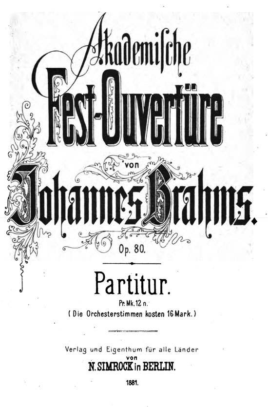 Muchos años más tarde, en 1879, tras algún intento infructuoso por parte de alguna otra universidad, Brahms aceptó ser investido como Doctor honoris causa en Filosofía por la Universidad de Breslau. La candidatura había sido empujada por su amigo y director de la Sociedad Orquestal de la ciudad, Bernhard Scholz. En un primer momento Brahms envió una carta de agradecimiento, pero Scholz informó al compositor de que la universidad esperaba algo más protocolario y que demostrara mayor sintonía: «¿No querrías escribirnos una “sinfonía doctoral” para Breslau? Por lo menos esperamos un canto solemne…». La respuesta de Brahms fue “una alegre selección de canciones estudiantiles a lo Suppé”, la Obertura del festival académico, op. 80, compuesta para que Scholz no se sintiera “demasiado avergonzado de su huésped”, en palabras de Brahms. Lo realmente interesante de la pieza es la cantidad de registros que maneja a pesar de ser relativamente corta. Encontramos extraversión gracias al uso de tres melodías universitarias (Gaudeamus Igitur entre ellas) pero también solemnidad, cierto sentido del drama y un hedonismo orquestal que habla de aquellas semanas de juventud en Göttingen rodeado de idealismo. El 4 de enero de 1881 Brahms recogió el título en persona y dirigió la obra frente al claustro.